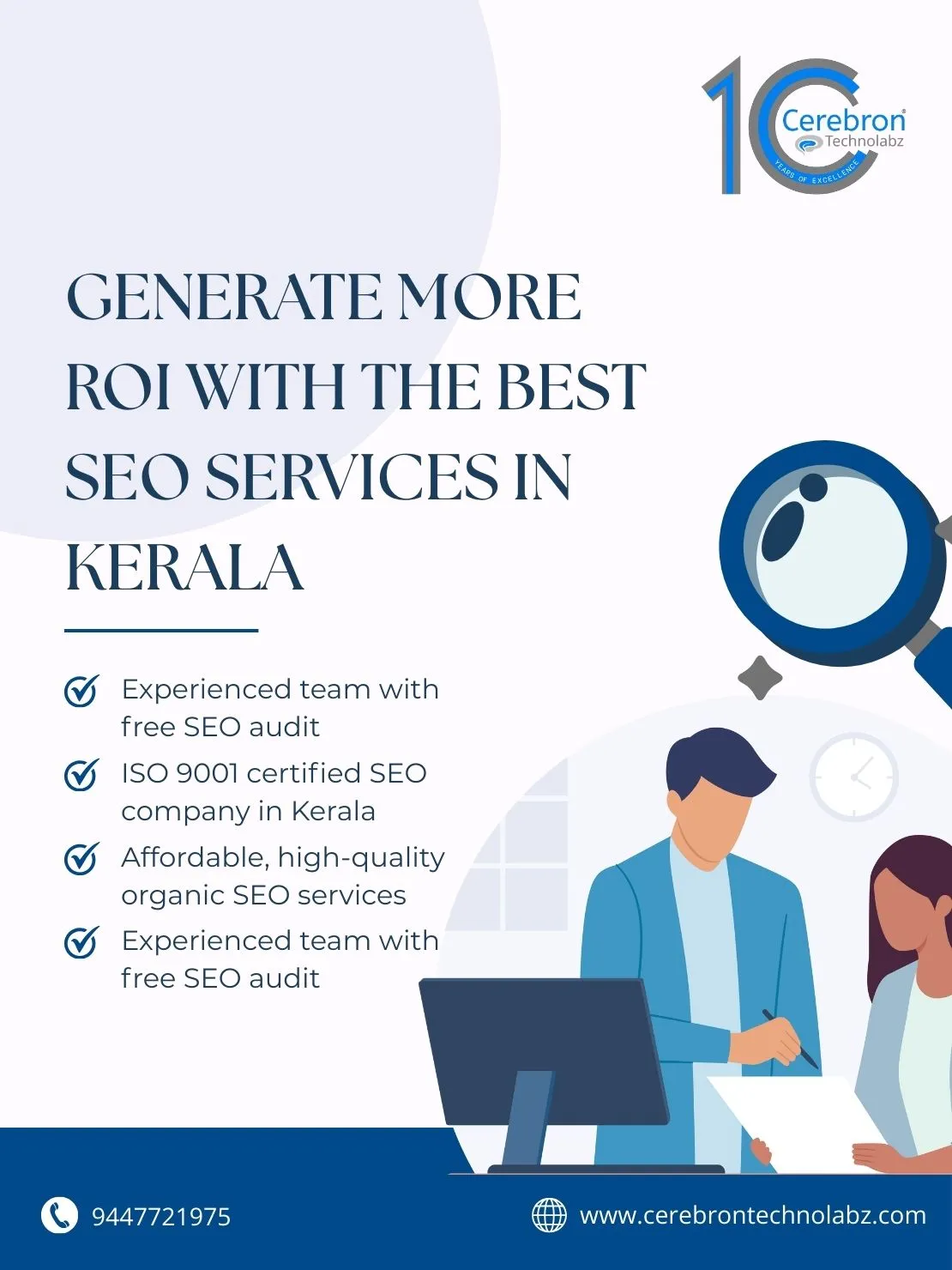 Cerebron Technolabz is the best ISO 9001 certified SEO company in Kerala, which has a reputation for being a trustworthy and ideal business partner. Here, we consistently prioritize our customer's needs and provide them with the appropriate marketing strategies. With our expertise in digital marketing, we can provide our clients with the best return on investment and help them build their businesses successfully in SERP's.